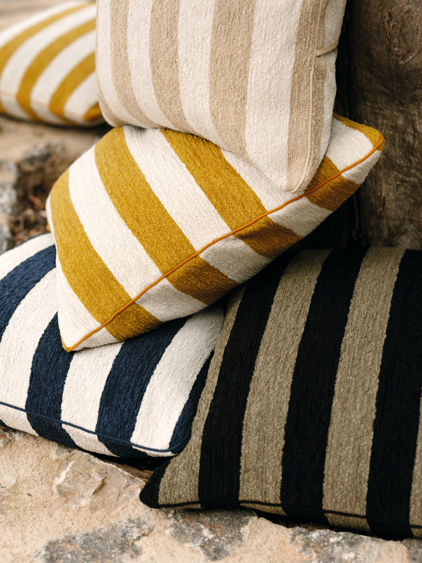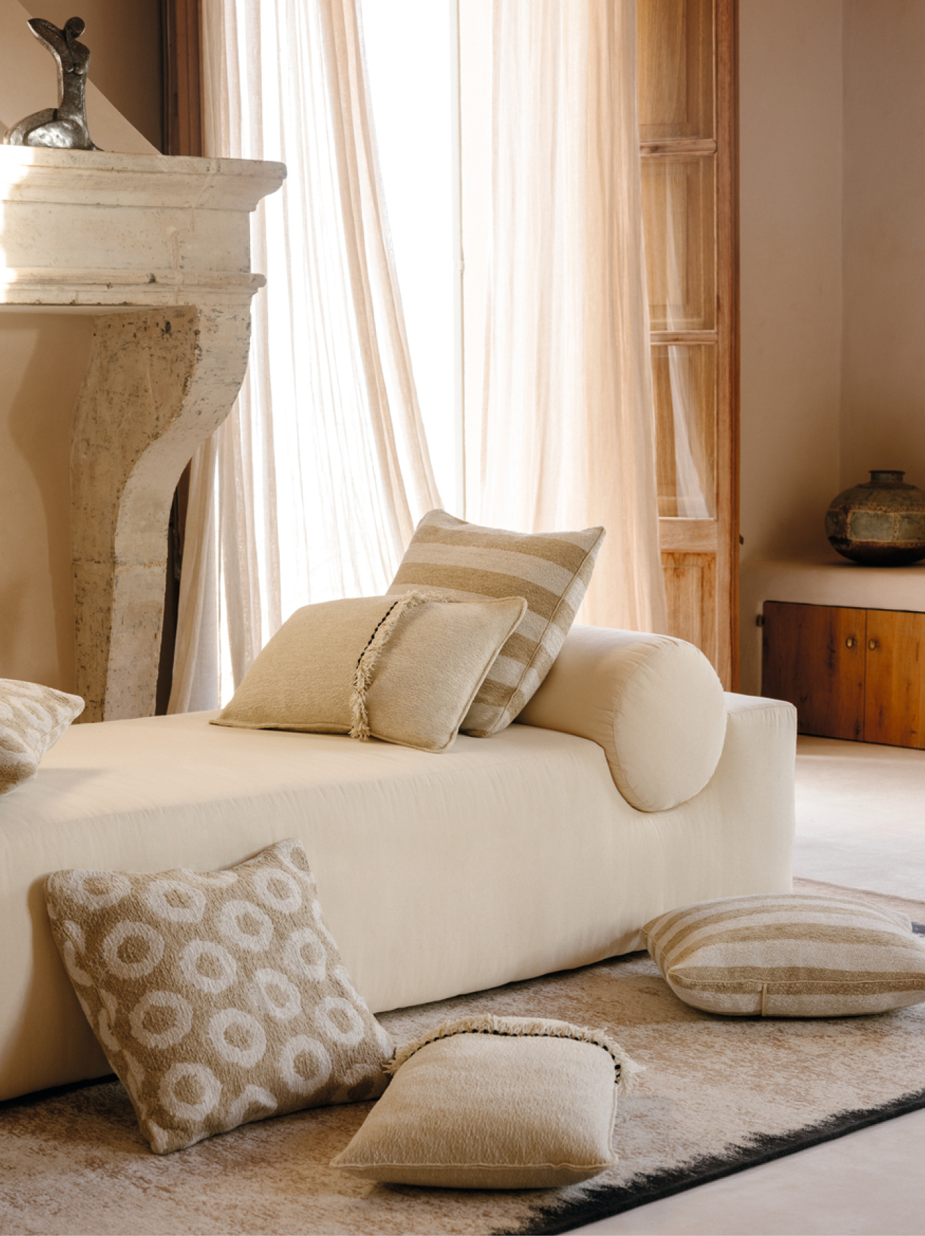 À l’inverse, la finca espagnole semble aujourd’hui absorber les codes de la résidence d’artiste. Moins lieu de passage que territoire personnel, elle compose un décor tout aussi libre. C’est dans cet esprit que s’inscrivent les collections in/outdoor d’Élitis. Les coussins Mirage, Manuka, Casoar, Canyon, et les tapis Kalahari et Wallis avivent l’âme créative de la maison qui devient un atelier intime et habité, où chaque pièce, chaque textile, chaque objet raconte un faire, autant qu’un mode de vie.